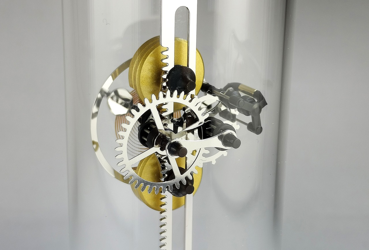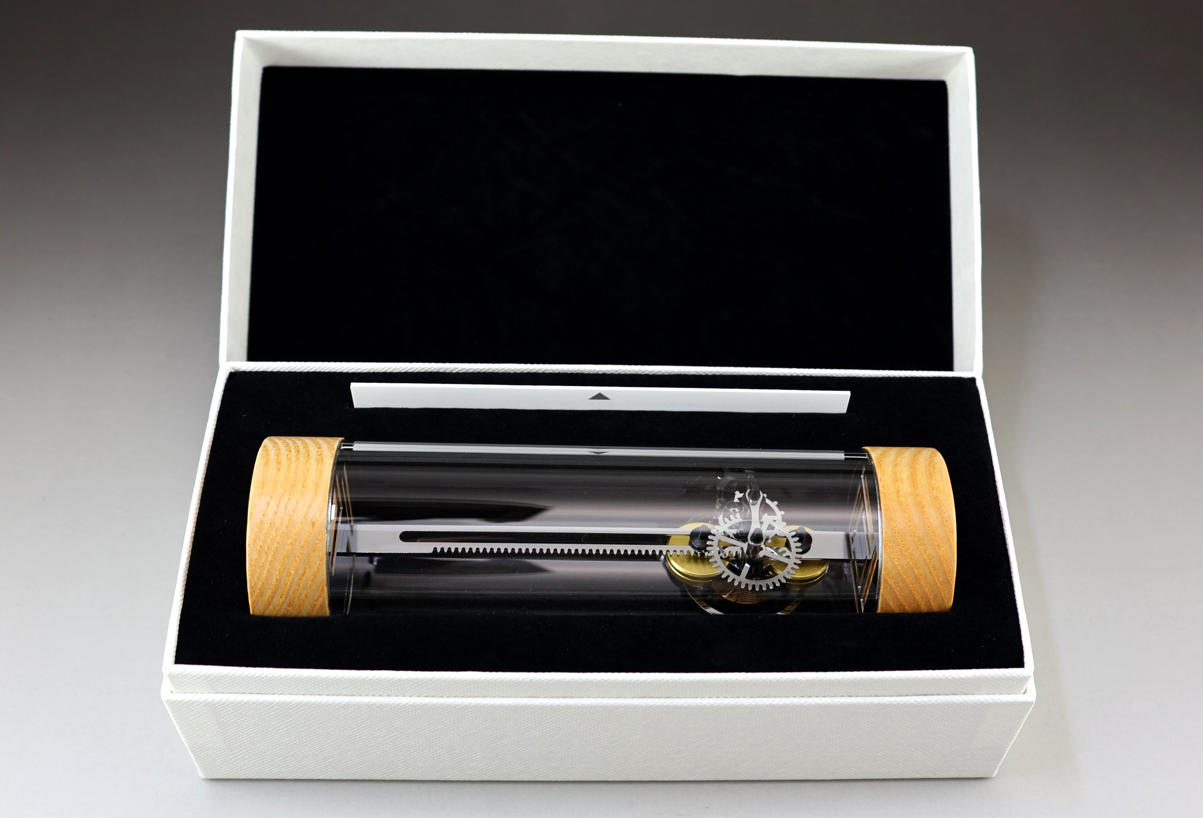 ガラスの中に閉じ込められた部品たちが地球の重力で引っ張られ、落ちていこうとする力で動きます。また、手に取ると微かですが、チクタクと鼓動にも似た音と小さな振動を肌で感じることができます。